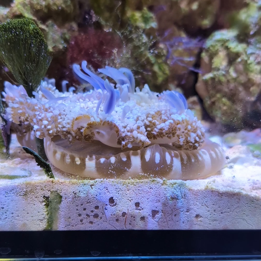 Upside down jellyfish must be kept in a low flow environment with no fish or invertebrates that will pick at or damage them. They eat plankton and small particle foods, and also photosynthesize. They do great in macro algae tanks!